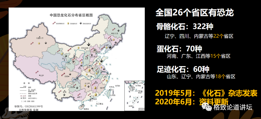 我们曾经做了一个统计,结果显示在全国的26个省区都发现了恐龙化石。图上的小骨棒标识是根据骨骼化石命名的中国恐龙,这里显示的有322种。当然到现在已经有更多了,能达到三百四五十种。根据蛋的化石命名了70种中国恐龙,根据恐龙的足迹化石又命名了60种。