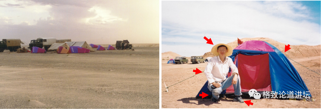野外的工作环境比较艰苦,尤其在戈壁的时候,我们会经常遇到沙尘暴。图片中是沙尘暴刚刚起来的时候,之后就会漫天黄沙,这个帐篷的一侧都已经被吹瘪了。