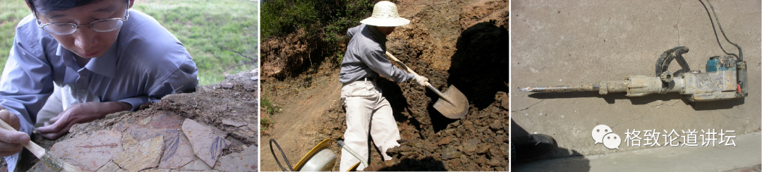 左边这张图是我在河北进行野外研究的时候拍摄的。这里已经有一个小小的蝾螈化石暴露出来了,而且在它旁边还有一个像小草似的树叶化石。然后我就要用到这个铁锹,这是一种常用的工具。右图是一个叫做电镐的工具,它需要接到发电机上。发电机用汽油来驱动,然后就可以用电镐把化石周边的石头打松,这样容易把化石完整地取出来。