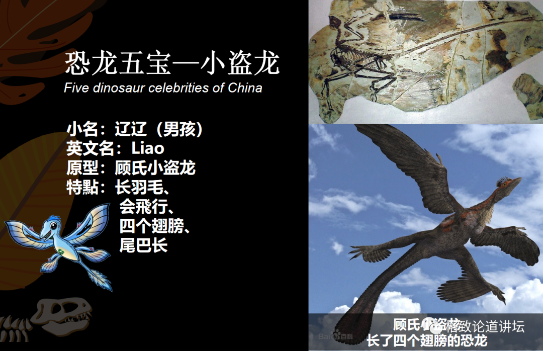第四种恐龙是比较小的恐龙——小盗龙,全长不到1米。这种恐龙最大的特点就是身上长着羽毛,而且它的前肢和后肢上都长了飞行用的羽毛。
