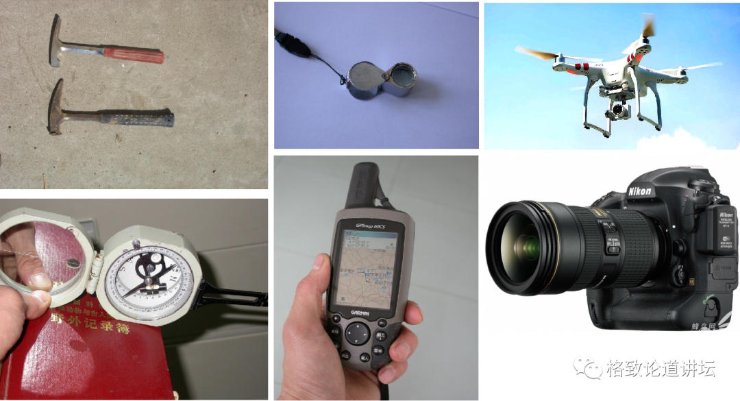 左上角的两张图展示了锤子和放大镜。左下角的图是一个罗盘,罗盘可以指示方向,也能测量地层的倾斜角度,还有很多其他的功能。后来又出现了其他工具,比如GPS、无人机、高分辨率相机等等。我们可以用这些工具更好地了解当地的地质和地貌。