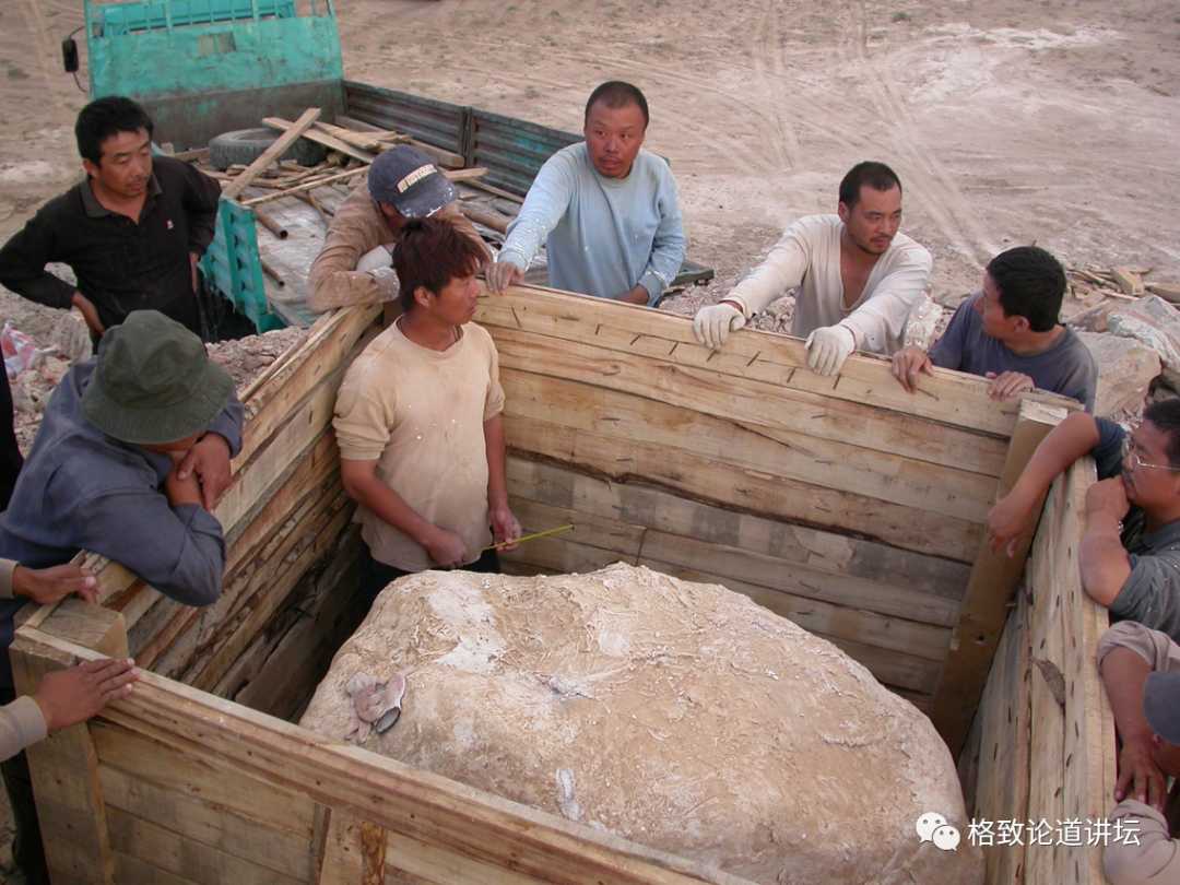 但有时候人算不如天算,当时测量出的化石石膏包的大小和结束时的最终形态不一样,比如图片中就是箱子做大了的情况。在中间站着的木工师傅就得回去重新改一下,把箱子尽量改得和岩石的大小形状一样。