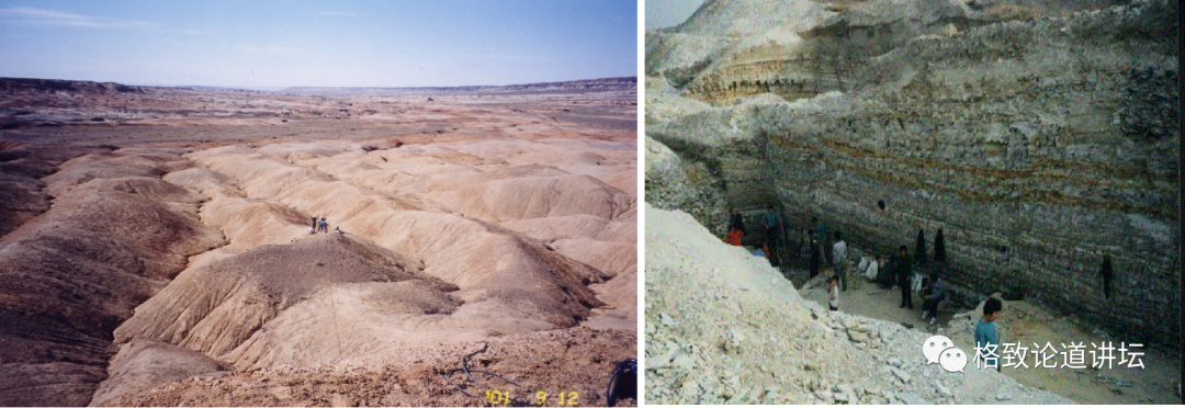 那么,要到哪里去找这些恐龙化石呢?下面左图是位于我国新疆的保存恐龙化石的岩石,是一种砂岩或者泥岩。砂岩和泥岩看起来都是成块的,恐龙化石就埋藏在里面,砂岩更粗糙。