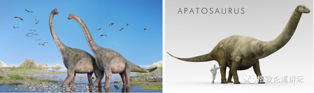 左图展示的是腕龙,腕龙有个特点,它用四条腿走路,但它前面的两条腿比较长,给人一种昂首挺胸的感觉。右边这个恐龙是迷惑龙,也是北美一种典型的恐龙。
