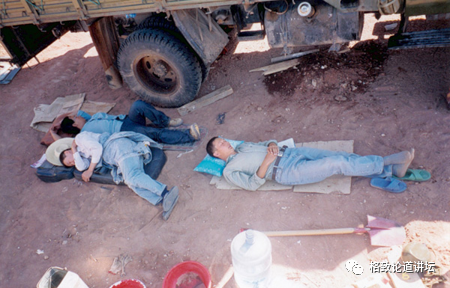 中午午休的时候,因为帐篷里太热了,所以一般我们要利用一辆车的阴影,躺下休息一下。野外的工作环境可以说是非常地艰苦。