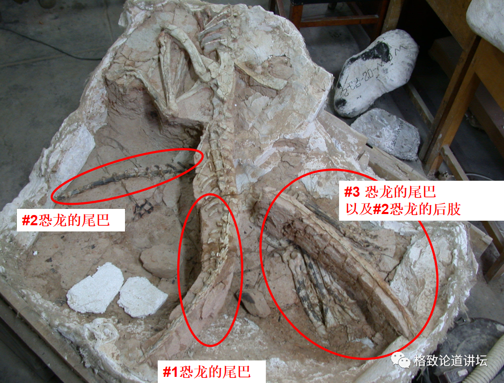 这是修复之后的一个大石膏包,这里有三条恐龙,而且分布在不同的层位上,所以这是一个非常精彩的化石。
