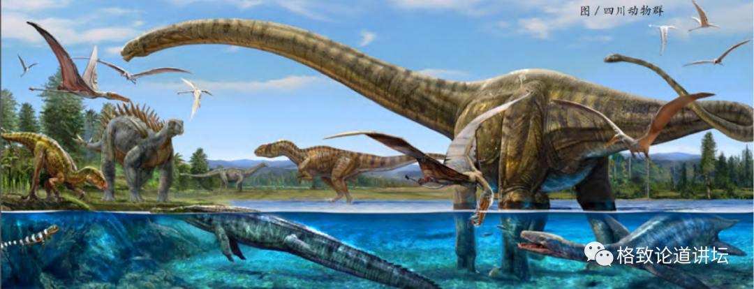 这就是恐龙在中国四川生活的情景。画面中最大的、脖子特别长的就是马门溪龙,还有其他各种各样的恐龙以及天上飞的翼龙等等。