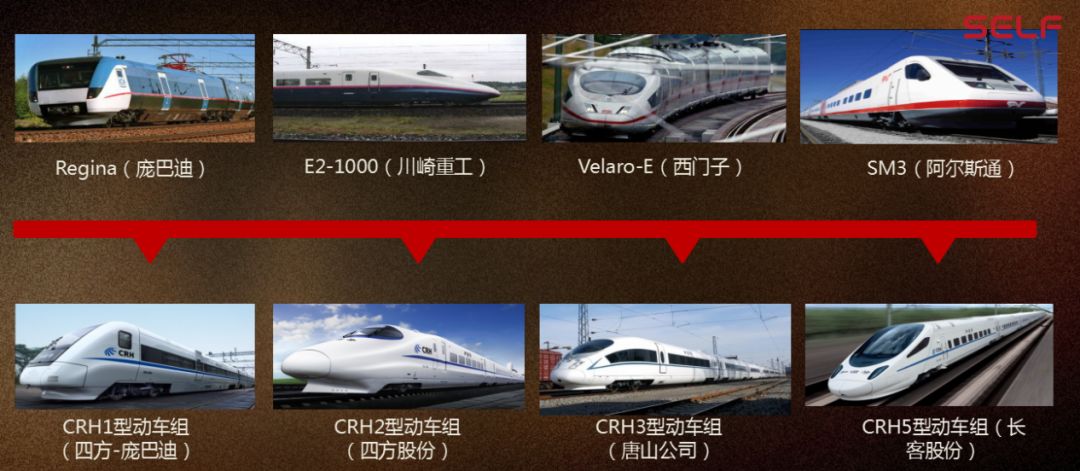 实际上引进是从2004年开始的,大家可能见到的是2008年。在2020年的规划中,我们国家要建高速铁路网,这么长的高速铁路网,车从哪来?引进的高铁技术?不对,引进的是生产线,别人的技术根本不卖给我们。从2004年,上图从左边第一个、第二个和最后一个,这几个当时我们叫动车组,通过既有线路的改造能够跑到200公里。