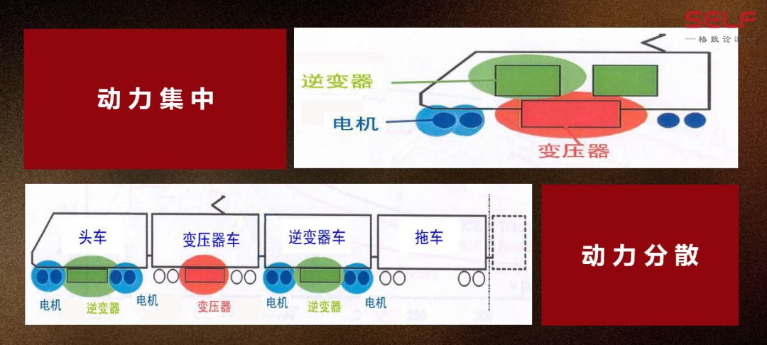 大家听得多的是高速列车,但是前面又提到动车组,动车组和高速列车好像都混起来了,他们之间什么区别呢?原来的绿皮车、现在的货车都是动力集中型,什么叫动力集中型?前面有一个机车带着后面的车厢往前跑,就是我们平时说的“火车跑得快,全靠车头带”,是车头有动力,它带着后面的车厢跑。