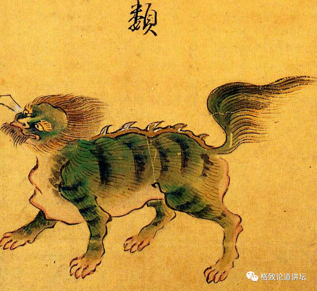 《山海经》里也不全都是妖怪,比如“类”。《山海经》的第一篇是《南山经》,《南山经》里有一座山——亶爰之山,这座山上有一个怪兽,名字叫类。它的形状像狸猫,背上有鬃毛,像下图中所展示的像狮子头似的。
