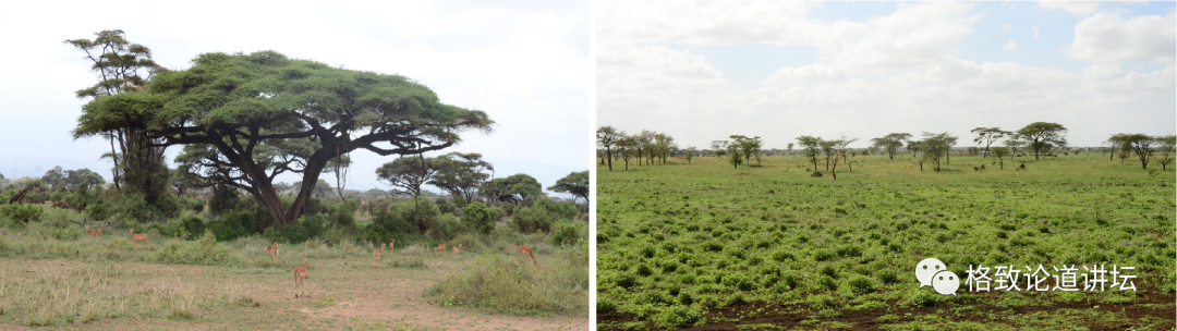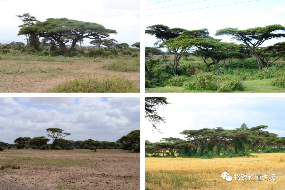东非地区有个东非高原,海拔大概有1000多米。在这里比较占优势的植被类型被称为稀树草原,下面这张图就是它的典型场景。