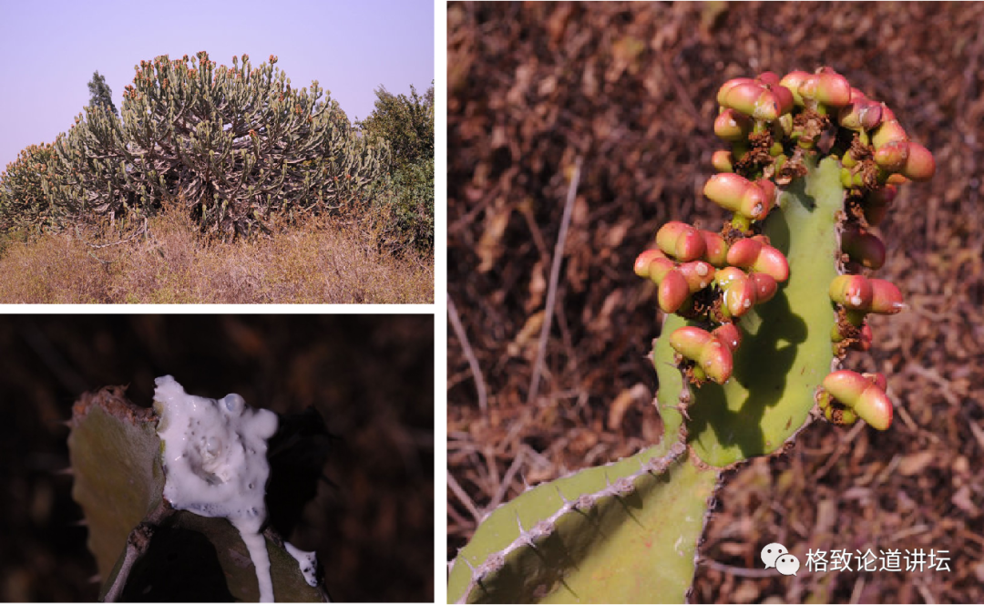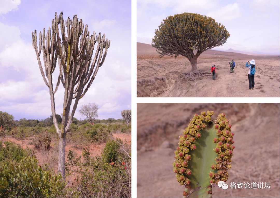 这种大戟能长到六七米高,外形像仙人掌,但是它和仙人掌没关系,它是大戟科的类群。整个树的叶子完全退化掉了,只剩下绿色的茎干来进行光合作用。右下角的图片是它的花。