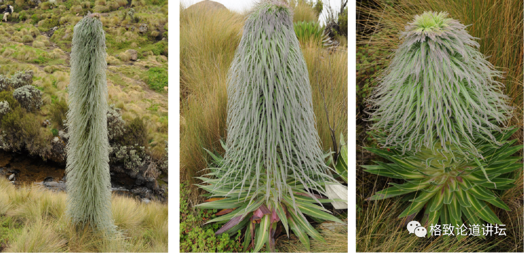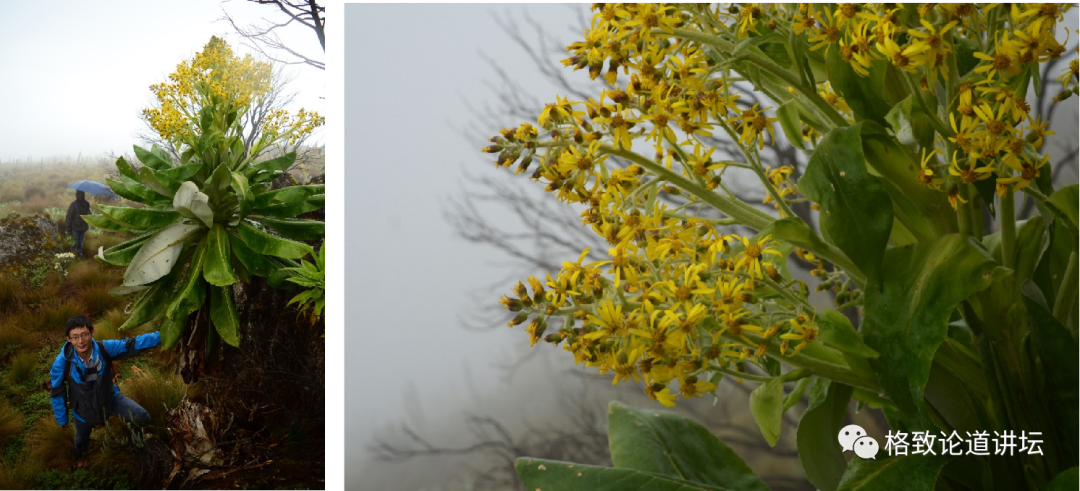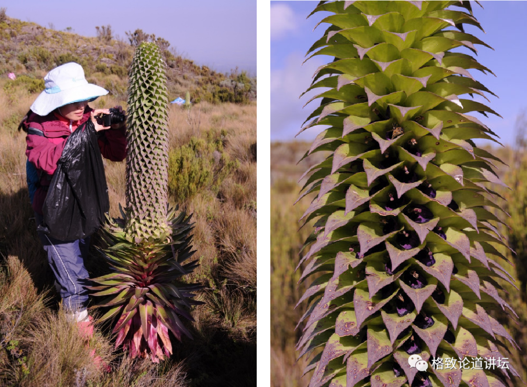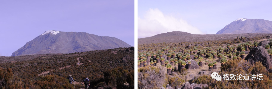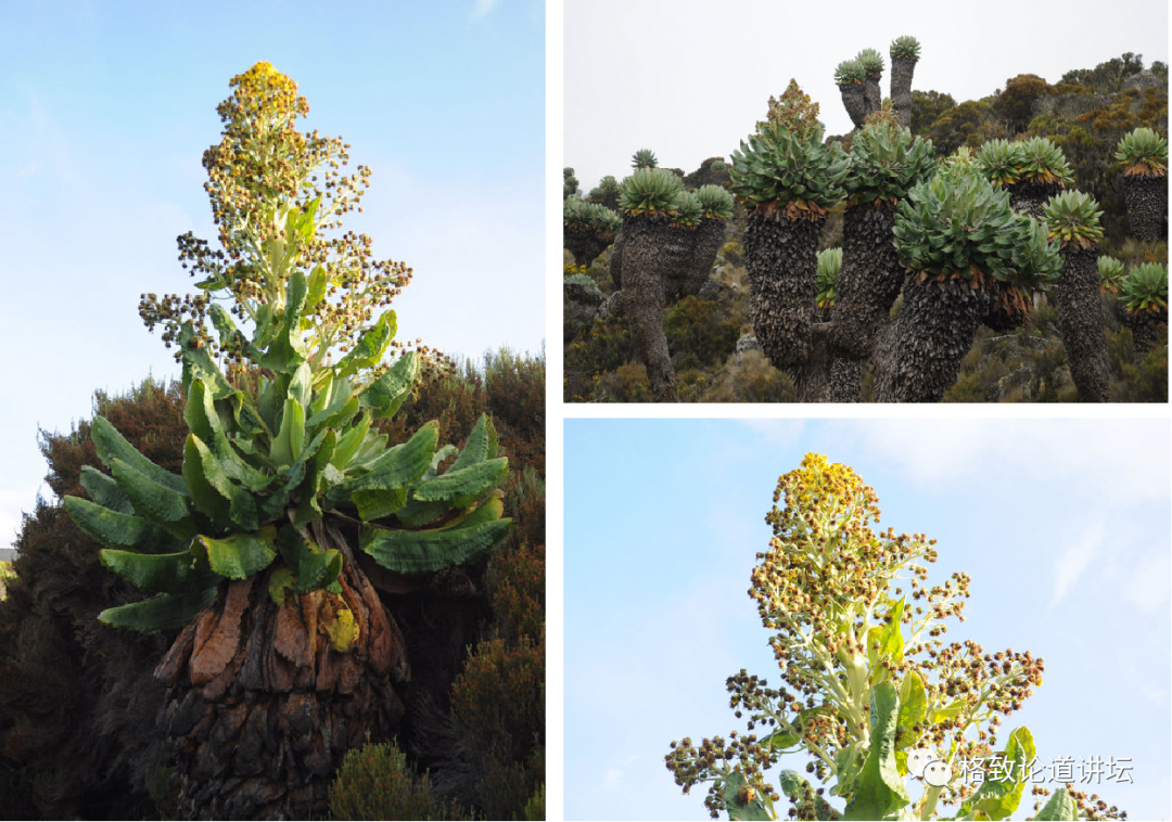 这就是乞力马扎罗山的主峰。在100年前可能整个主峰都是覆盖冰雪的。现在因为全球温度升高,所以只剩山头那一点雪了。要想在这种状态下生存,很多植物会采取一些保暖措施。比如右图中主峰下这一片长得像莲花的乔木状的植物,它们叫做千里木,有好几米高。