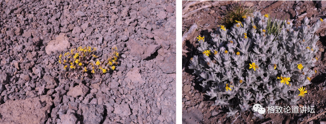 比如这是一种小型的千里光,叫做垫状千里光。为了防风,它只有10公分高,长得很矮,浑身密布白色绒毛来给自己保暖。这是非洲当地能够在海拔最高的地方生存的一种植物,可以长到5300米甚至5400米的样子,它的周围已经没有其他任何的生命了。