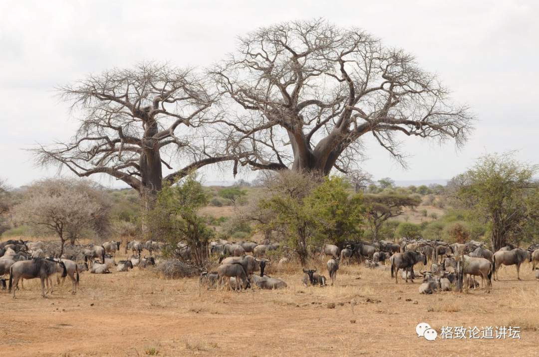 等猴面包树结果之后,就到旱季了,所有的叶子会掉光,如上图所示。当地的很多动物会吃猴面包树的果实,也借此来帮它传播。