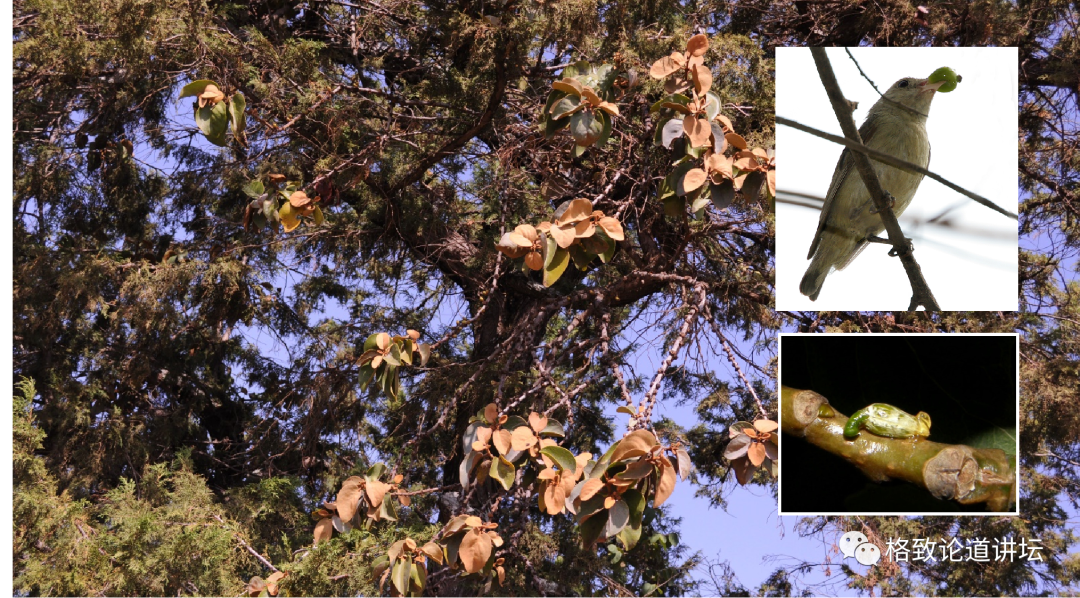 上面这张图的背景是一株柏树,但是柏树上长出的应该是小的叶子,为什么会长出这种很宽大的叶子呢?其实,这是一种寄生在柏树上的桑寄生。它的果实成熟之后颜色非常鲜亮,就会吸引鸟类来吃。但它的果肉很黏,等鸟排便的时候,种子就被果肉黏在鸟屁股上了。这时候,这只鸟就得想办法去擦屁股,就要找一根枝条或者树枝去蹭,蹭了半天,终于把种子蹭到了枝条上。