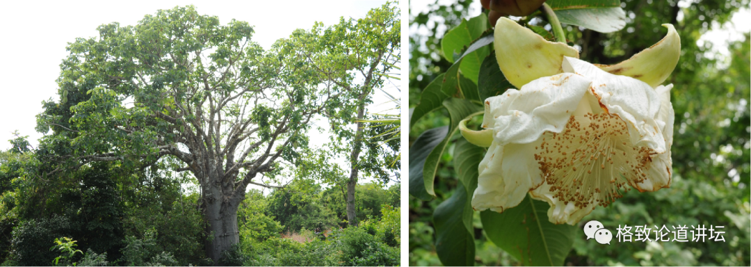 等到雨季,猴面包树就完全是另一种形态了。雨季的时候它的叶子非常绿、非常大,而且它还会开白色的花,花也很大。