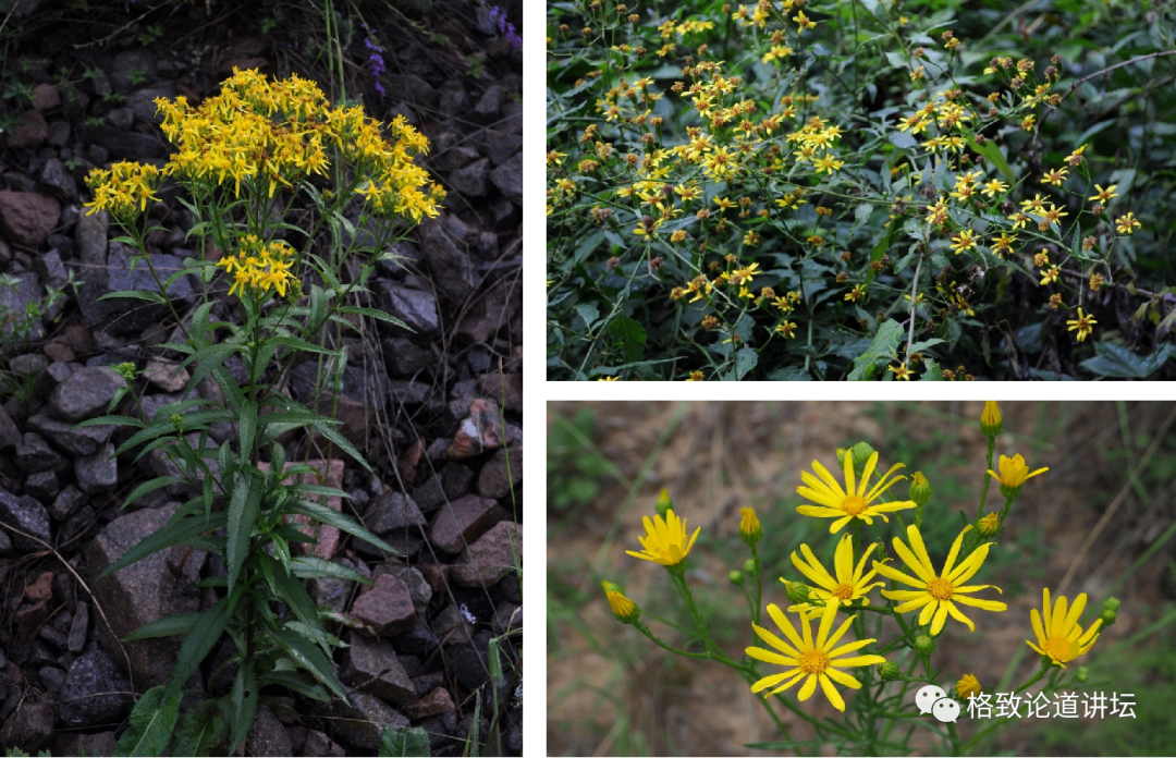 林荫千里光 Senecio nemorensis(左)、千里光 Senecio scandens(右上)和琥珀千里光 Jacobaea ambracea(右下)