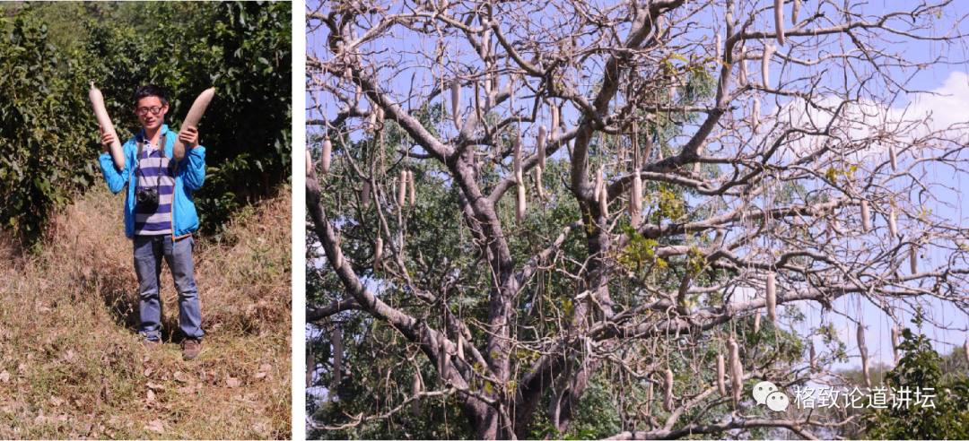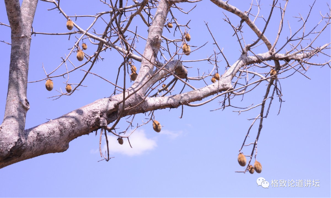 我们看到吊瓜树满树吊的都是这种瓜,非常大,皮又很硬,也不容易打开。人是吃不了吊瓜树的果实的,那谁会吃呢?就是大象。大象在旱季会以这个瓜为食物,吃完了再把它的种子撒播到远处。