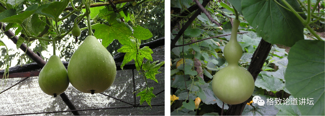大家可能觉得,上面右边图片这样的才是葫芦的形状。但其实古代人用葫芦瓢舀水的时候,是左边的这种形态。后来又培育了装水和装酒的酒葫芦,才变成右边葫芦的形状。它们都是从野生状态的球形类型培育而来的。