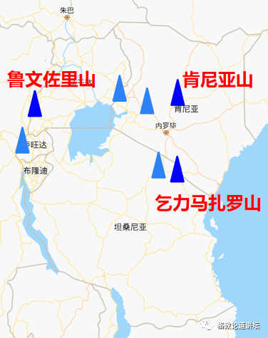 除了草原,非洲也有很多其他的生境。因为这里处在东非大裂谷地带,所以有很多的火山。在很久以前喷发的火山形成了一些高山,比如非洲最高的乞力马扎罗山,第二高的肯尼亚山,第三高的鲁文佐里山,它们都在东非这一带。