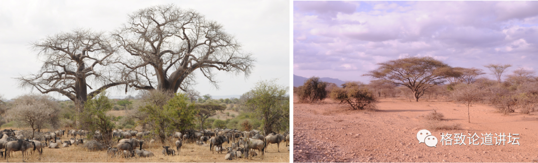 大家可以看到,左图植被前方是正在迁徙中的角马群,后面是一些稀稀拉拉的乔木,其中有猴面包树、金合欢等。这就是稀树草原旱季时候的样子。右图也是稀树草原旱季时候的样子。那里的草本植物在旱季就会完全枯死,只留下地下部分;树上的大部分叶子也都落掉了。