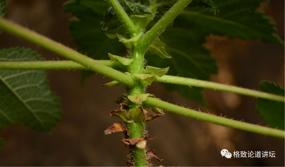 把它放大,我们能看到它的叶柄和茎上有密密麻麻的小刺。一旦皮肤碰到它,它就会马上把里面的毒液注射到我们的皮肤里,然后会起一个泡,疼上一个星期甚至更长时间。