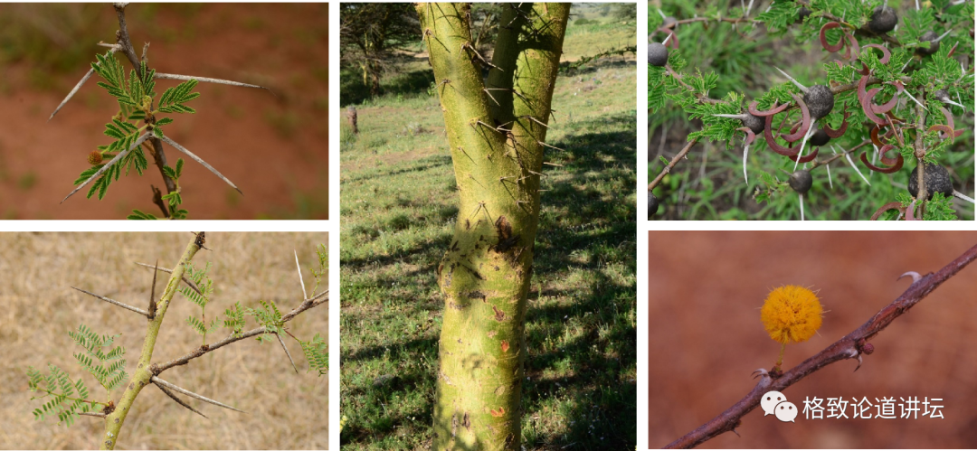 比如左边的这两张图中,叶子还没长大,刺就长得相当长了,先把幼嫩的叶子保护起来。为了防止一些动物爬树,它们的树干上也会长很多刺,让动物们爬不上来(中)。还有一些金合欢虽然没有那么长的刺,但是它长着一种倒弯钩的刺,也很厉害(右下)。