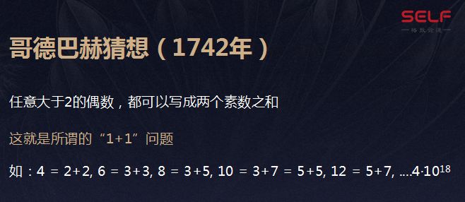 还有没有解决的数学难题吗?有。对我们中国来讲,最熟悉的就是哥德巴赫猜测。一个大于2的偶数都可以写成两个素数之和,这就是所谓的“1加1”问题。例如4等于2加2,6等于3加3,8等于3加5,10等于3加7,也等于5加5,12等于5加7等等,人们用计算机验证了所有小于等于4乘10的18次方的偶数,结论都对,可是到现在为止,人们仍然无法证明它。