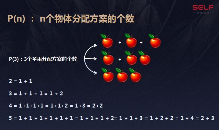 下面的例子跟我们的日常生活有关。一个自然数n的分割函数,是n个物体分配方案的个数,比如说n等于2有两种分发;n等于3有三种分发;等n等于4的时候就不是4种分法了,而是5种分法;n等于5,有7种分法。