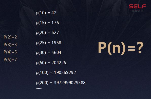 我们看一下数字,P(2)等于2,P(3)等于3,P(4)等于5,P(5)等于7,P(10)等于42。大家看到P(100)已经很大,而到P(200)那就更大。看了这组数据以后,我相信你会说增长太快了,没法数,但是有人会数。