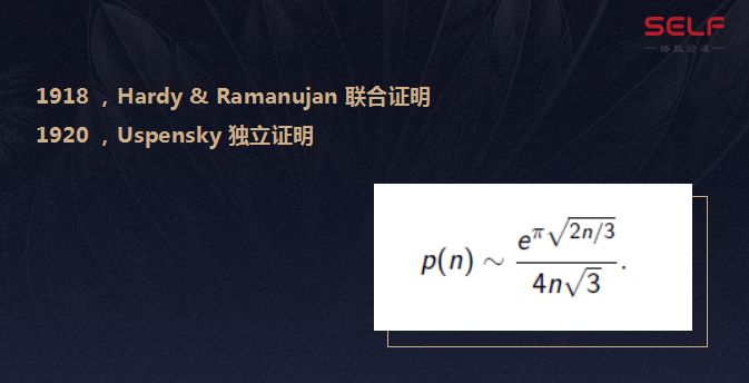 Hardy和Ramanujan在1918年,Uspensky在1920年独立证明,当n充分大时,P(n)与近似号右边的初等函数的值相近。同样,近看P(n)的数字跳跃的很厉害,看不出什么规律,远看它却以一个初等函数的规律显示出来,这个结果是猜不出来的,他们是用了数论里面的圆法,经过复杂的计算得到的,他们做出了别人难以想象的结果,分割函数也常出现在量子物理中。