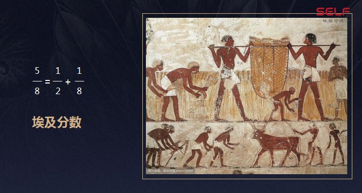 用现代数学表示,就是5/8等于1/2加1/8,它就是一个埃及素数。它是古埃及人刺在一种不易腐烂的树叶上的分配方案,是考古学家发现的。一个数称为埃及分数(视频中徐老师口误为“埃及素数”),如果它是有限个分子为一的分数之和,古埃及人在类似的分配方案中,意识到了素数的特性。