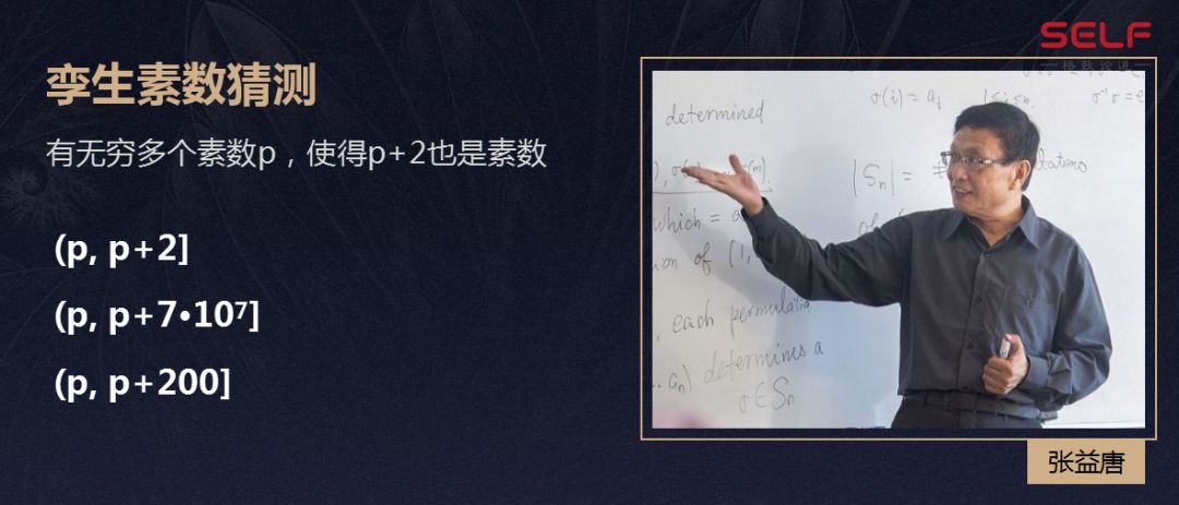 除此之外,还有一个问题叫做孪生素数猜测,存在无穷多个素数p,使得p+2也是素数,这是个千古之谜。到2013年,华人数学家张益唐证明了存在无穷多个素数,使得从p到p加7000万这个区间内也含素数,这是数论领域里面一项革命性的工作。