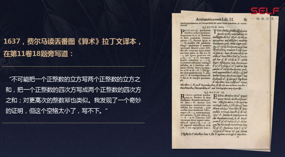 1637年费尔马在阅读丢番图《算术》的拉丁文译本,写到:“不可能把一个正整数的三次方,分成两个正整数的三次方之和;不可能把一个数的四次方,写成两个正整数的四次方之和;对正整数的更高次幂也类似。我发现了一个奇妙的证明,但这个空格太小了,写不下。”