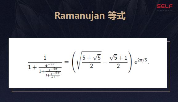 上世纪初,印度有一个天才数学家Ramanujan,他的命还是比较苦的,英年早逝。在剑桥大学见到Hardy之前,给Hardy写了一封信,内含他发现的等式。左边是个无穷的连分式,而右边却是个简洁的初等的表达式。Hardy看到后说:“它完全击溃了我,我之前一点也没有看过这样的东西,只有一流的数学家才能写出来!” 这就是让人眼前一亮的数学。