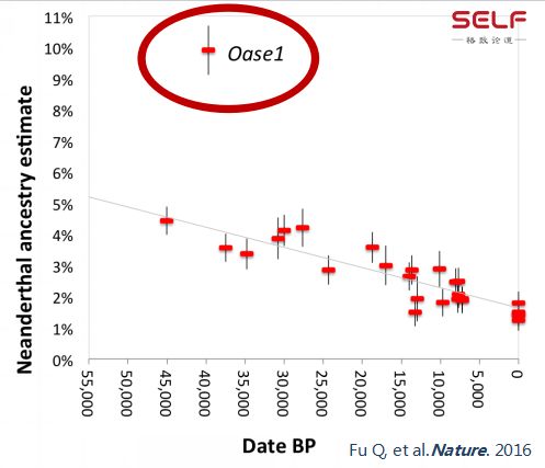 此外,自罗马尼亚发现的一个约4.5万年前的男性现代人个体(oase1),经分析体内含有高达10%的“尼安德特人”成分。付巧妹经过研究证实:这一特殊个体的曾曾曾祖父母中有一个是古老型人类——尼安德特人!