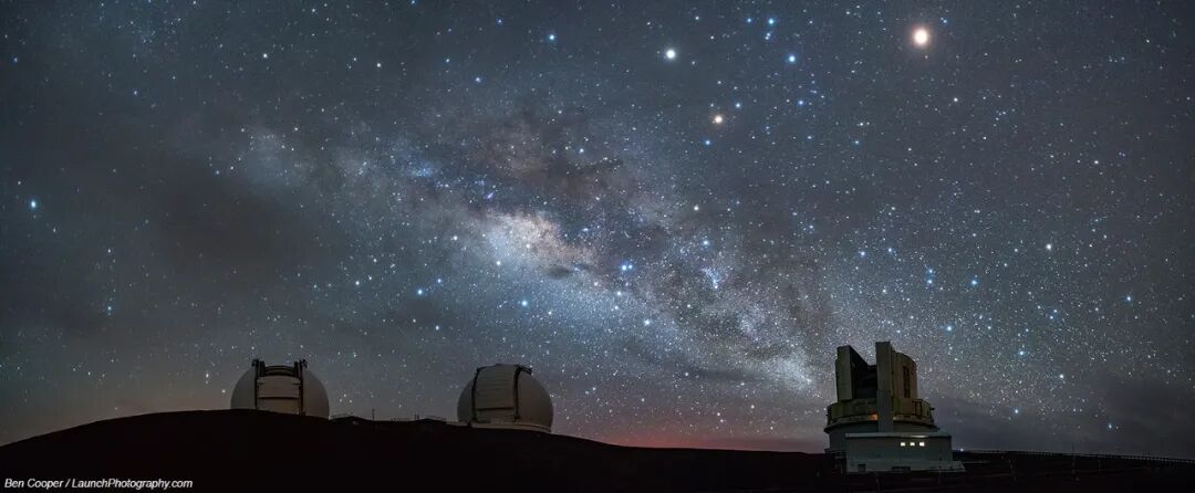 世界上有很多天文台,但在中纬度地区,我们认为只有三个是一流水平的。这是位于美国夏威夷群岛莫纳卡亚火山口上的大天文台。照片中除了灿烂的银河之外,还有左边两个10米的望远镜以及右边日本的8米望远镜。