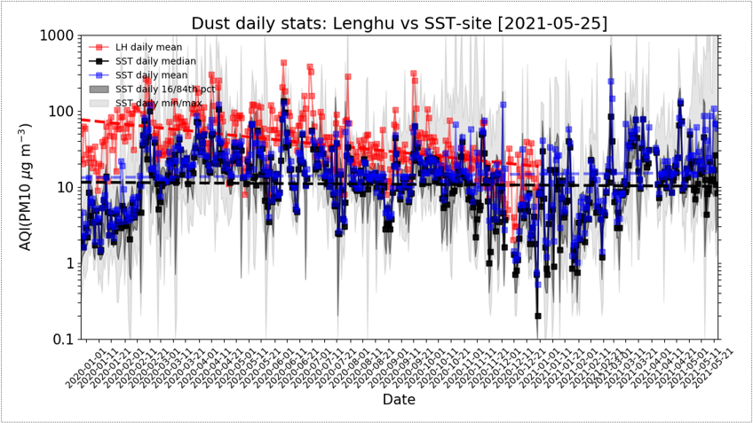 上图中红色的点是在冷湖测到的沙尘的情况,蓝色的点是山上的情况,数值越高的话表示空气质量越差。这个图是一个对数坐标,相差一个的格子就代表空气质量指数相差10倍。所以实际上山上的空气质量比山下要高一个量级。