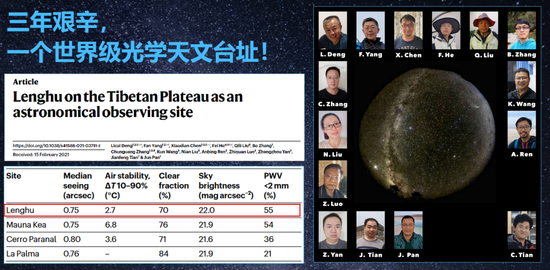 经过三年艰辛,我们终于得到了可以判定这个台址质量的数据,并在2021年8月18日正式上线,发表在顶级科学期刊《自然》上。通过数据对比,从天文观测台址的专业的质量要求来看,冷湖基本上与国际上一流的几个台址是持平的。实际上在某些方面,比如看得刁的评价参数水汽含量上比其他台址更好。这也可以说明它是国际一流的台址,我们也更希望冷湖是全世界最好的天文台址。