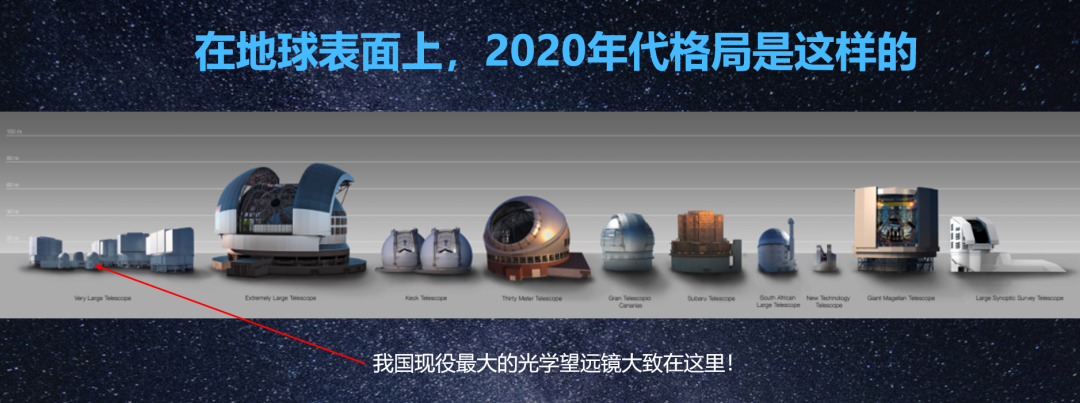 在21世纪的20年代,国际上天文望远镜的形势是:有若干台10米以上的光学望远镜,还有正在建造的三台30-40米的大型设备。中国的望远镜是什么情况呢?中国最大的望远镜,和国际上一代10米望远镜配套的辅助望远镜的口径是一样的,最大的口径只有2.4米,这种形势对我国来说非常紧迫。