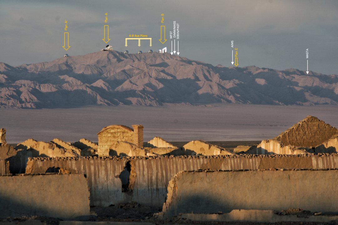 我再来展望一下未来。上图的前景是冷湖50年前的辉煌过后留下的废墟,它记录了以前的历史。再往远处看去就是赛什腾山,山上所有打标的地方都是我们将来建设天文台的台址点。白色的是我们正在建设的台址,包括从3800米开始的紫金山天文台的近地天体监测阵,那里大概有21台望远镜。因为近地天体对地球生命的威胁是最大的,所以我们需要对它进行监测。
