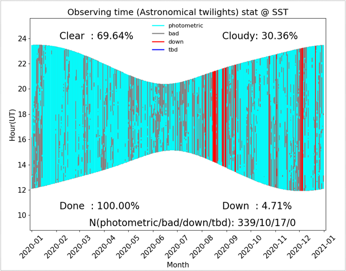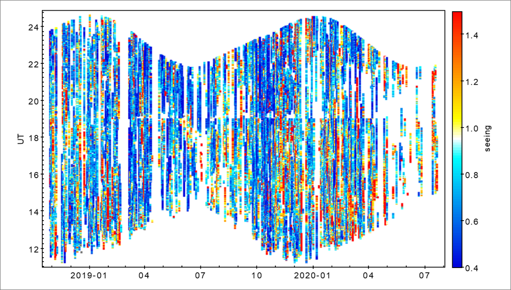 上图显示的是云量的数据。彩色的区域是每天晚上到第二天凌晨之间的时间,冬天长一点,夏天短一点。蓝色表示全天一丝云都没有,灰色可能是有一点云或者是阴天,红色是仪器没有电了或者坏了。所以数据表明,这个地方晴夜数是非常多的。