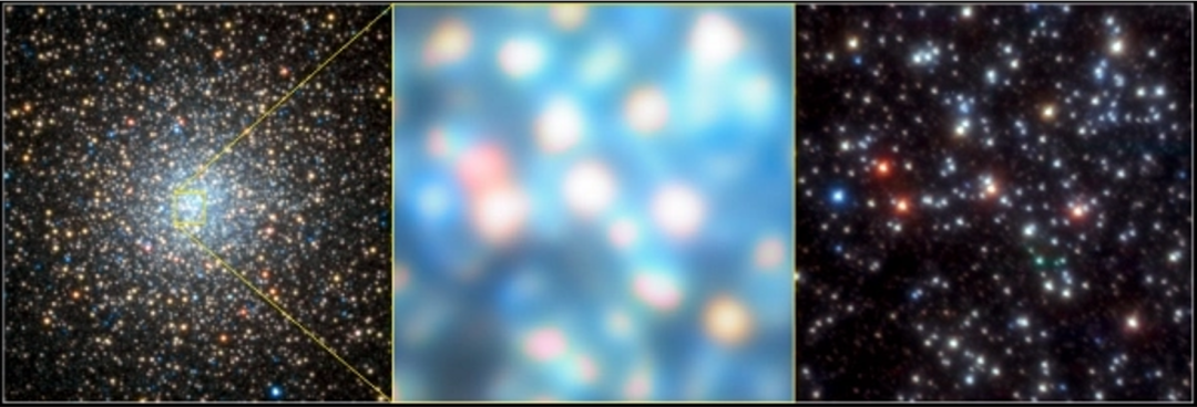 左图是一个星团,它的中央特别密集。以前,我们没有手段克服视宁度或者到大气外观测的时候,看到的星团是中间的这幅模糊的图像,但右边这幅消除了视宁度后的图像才是真实的场景。