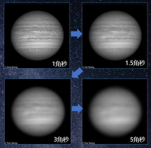 上面四幅图展示了从视宁度很好的1角秒到视宁度很差的5角秒观察木星的图像,我们可以从中得到在不同视宁度下的直观感受。所以视宁度也是影响大众观星体验的一个相当大的因素,对天文观测更是非常重要。
