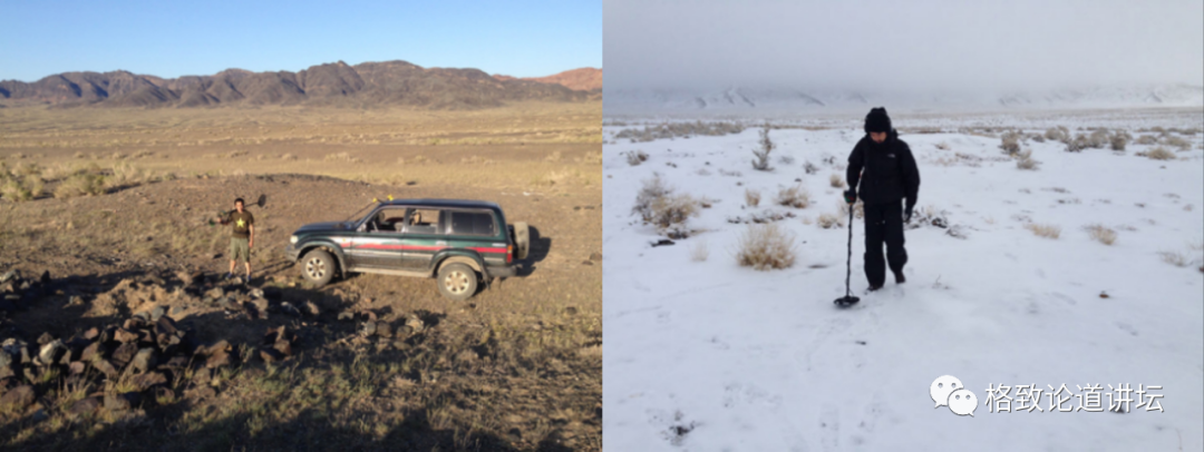 上图展示的是我们在阿勒泰工作的实际场景,左侧是夏天,右侧是冬天。如果大家想去阿勒泰找陨石的话,我建议千万不要冬天去,因为那里冬天气温非常低,有零下三四十度。我在那里工作了一段时间回来后,整个人的背部都是僵硬的,用了很多方法才慢慢好转。夏天的阿勒泰环境比较好,可以在戈壁和山坡去寻找一些陨石。左侧图中我身前的陨石坑,就是当年中国最大的28吨“银骆驼”陨落的所在地。