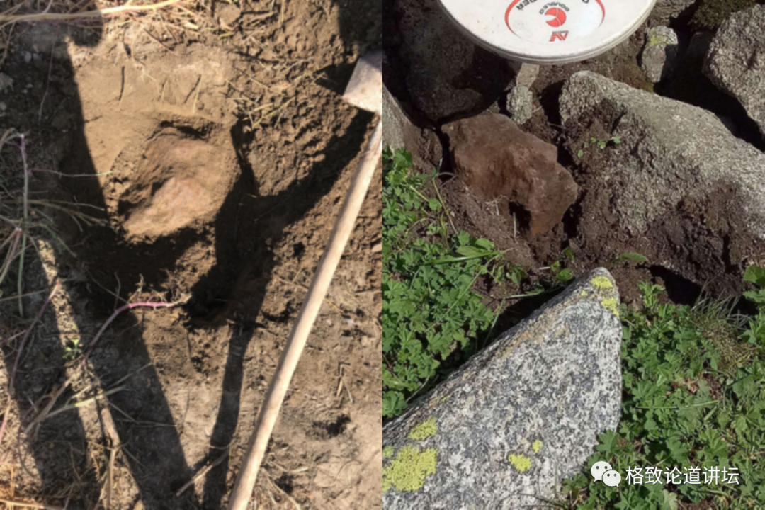 在阿勒泰,你可能会在土层下面发现陨石。因为没有太多的历史记载或者较好的碳化植物来做定年,所以我们只是推测,它们可能是史前时期就已经陨落在那里了。上图右侧拍摄于一个山坡上,我们可以看到,很多花岗岩中间夹杂着一块陨石。这颗陨石没有深入地表,在山坡上裸露着。