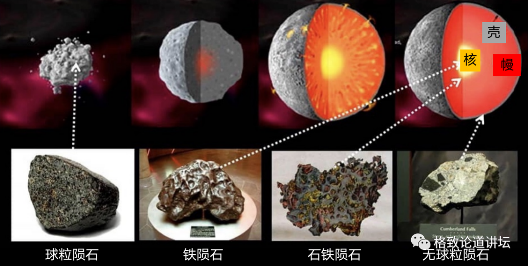 归根于成因,陨石可以被分为三类:石陨石、铁陨石、石铁陨石。石陨石相对比较复杂,它又可以被分为球粒陨石和无球粒陨石。球粒陨石是太阳系最原始的星云的尘埃;铁陨石差不多就是一个星球的核心部分——铁核;石铁陨石是幔层和核心交界的部分;而无球粒陨石是行星或小行星热蚀变分异的物质,就是一个星球的地表也就是壳的部分。