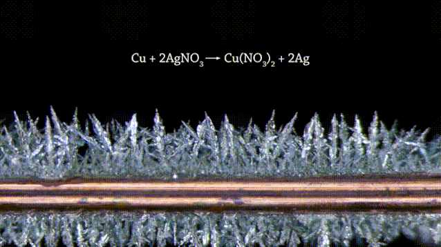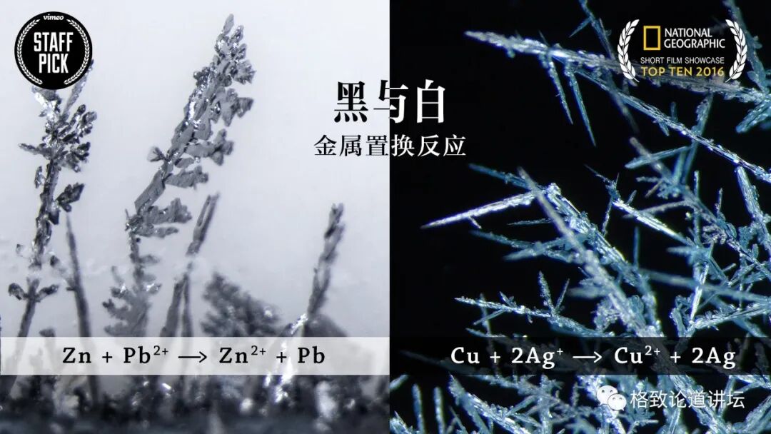 另外还有“金属置换反应”。这里我展示两个反应过程:金属锌在溶液中置换金属铅的反应和金属铜置换金属银的反应。用金属锌来置换金属铅,它生成了铅树,像一片森林。
