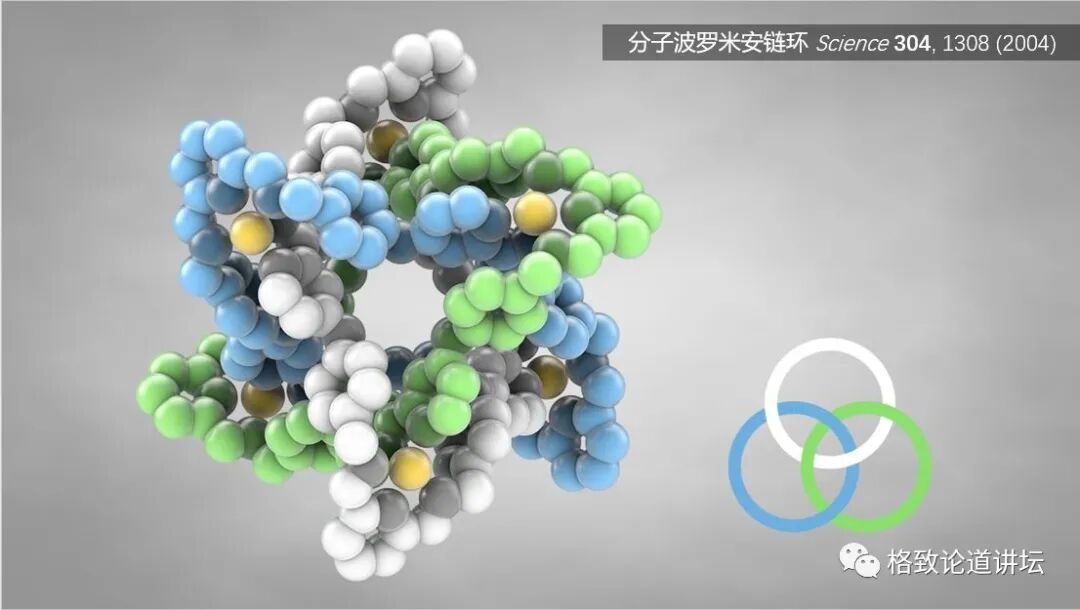 但是化学家可以在这么小的尺度,做出来有空间拓扑结构的像波罗米安链环的分子。而在如此小的尺度上完成如此复杂的操作,需要非常高超的技艺。